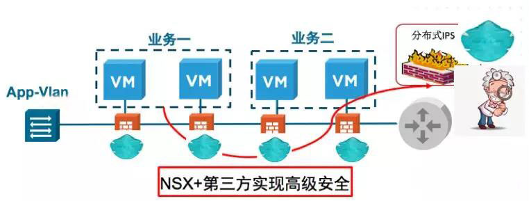 NSX價值四:除了“口罩”,外加“放大鏡”,NSX與第三方安全廠商集成,對業務間合法流量進行深入分析和入侵防御,進一步降低云化環境東西攻擊面。