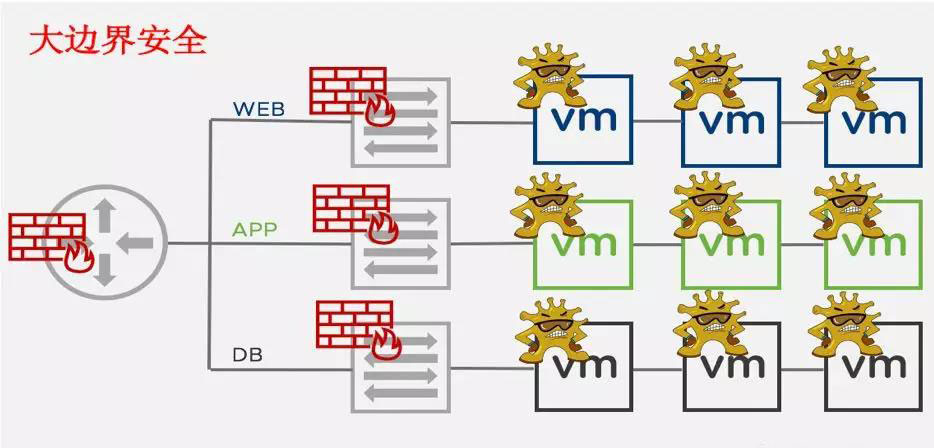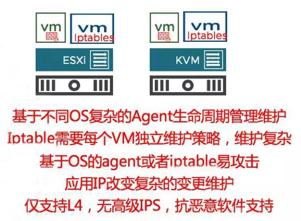 2、傳統通過硬件防火墻給應用VM”戴口罩“的方式效率低,上線慢,改動大,”口罩“非貼身,硬件防火墻距離應用遠,VM病毒開始傳播了,隔離還沒做好也不夠透徹細化至每個應用。傳統采用硬件防火墻交付東西安全策略,需要復雜的物理網絡配置,應用子網切分,命令式配置zone-based硬件火墻,往往甚至要改變現有應用配置,復雜耗時。