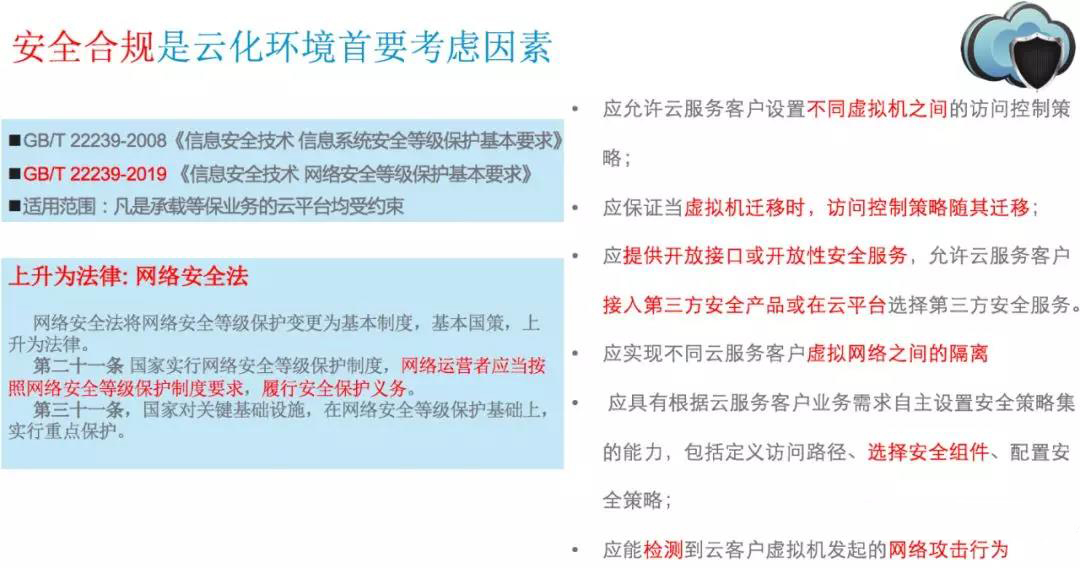 ? ? ? ?應用云化環境安全越來越重要,公安部在去年5月正式發布了云安全等保2.0,在去年12月已經正式實施,在合規性上,要求企業云化環境應用東西向”戴口罩“,微隔離,虛擬機遷移時”口罩“可以隨著業務遷移策略隨其遷移,檢測云化環境攻擊和飛沫,包含網絡安全法的發布賦予公安部執法權力。