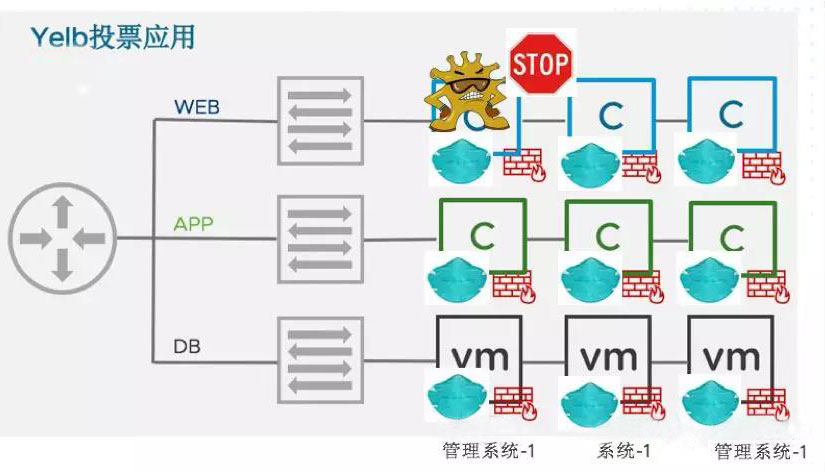 3、應用vm需要IT運維人員手工獨立給應用虛擬機”戴口罩“,裝代理或者IPtables軟件,維護復雜,易攻擊。甚至可以通過應用VM的操作系統漏洞或者應用漏洞,直接去掉虛擬機內部的”口罩“(代理形式的隔離方式)